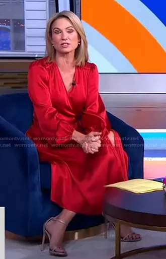 Amy Robach on Good Morning America on ABC was spotted wearing this red satin wrap dress on Good Morning America on Aug 16 2021's episode. Amy's Dress is the Fragrant Wrap Dress by Trina Turk.