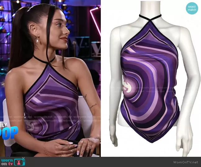 on E! News on E! was spotted wearing this purple printed halter top on E! News Daily Pop on Aug 16 2021's episode. 's Top is the Halter Top by Gucci.