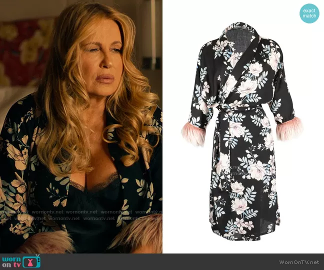 Tanya McQuoid (played by Jennifer Coolidge) on The White Lotus on HBO was spotted wearing this black floral fur trim kimono on The White Lotus on episode 'The Lotus-Eaters' (1x05) in Aug 2021. Tanya's Kimono is the Monroe Faux Fur Koi Kimono by Jennafer Grace.