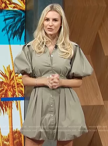 Morgan Stewart on E! News on E! was spotted wearing this gray puff sleeve dress on E! News Daily Pop on Aug 17 2021's episode. Morgan's Dress is the Cleo Balloon Skirt Poplin Shirtdress by Jonathan Simkhai.