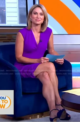 Amy Robach on Good Morning America on ABC was spotted wearing this purple v-neck sleeveless dress on Good Morning America on Aug 17 2021's episode. Amy's Dress is the Ruched Body-Con Dress by Maje . Amy's Shoes is the Baileigh Ultra Violet Suede Sandals by L.K. Bennett.