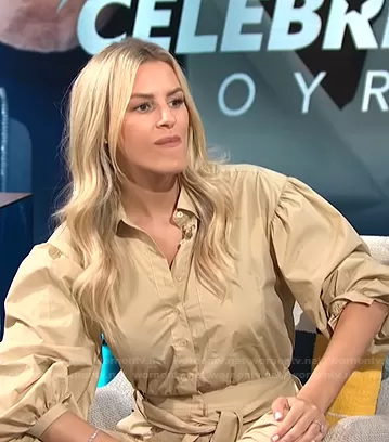 Morgan Stewart on E! News on E! was spotted wearing this beige tie waist poplin jumpsuit on E! News Daily Pop on Aug 18 2021's episode. Morgan's Jumpsuit is the Frankie Tie Waist Jumpsuit by Jonathan Simkhai.
