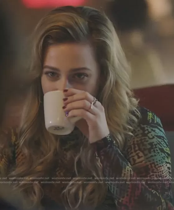 Betty Cooper (played by Lili Reinhart) on Riverdale on The CW was spotted wearing this multicolored printed mesh top on Riverdale on episode 'Citizen Lodge' (5x12) in Aug 2021. Betty's Top is the Abstract-Print High Neck Top by Just Cavalli.