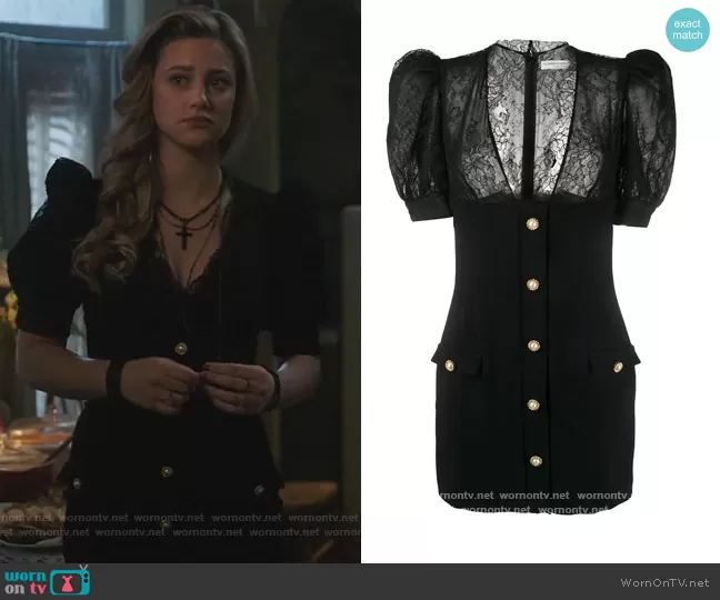 Betty Cooper (played by Lili Reinhart) on Riverdale on The CW was spotted wearing this black puff sleeve button down dress on Riverdale on episode 'Citizen Lodge' (5x12) in Aug 2021. Betty's Dress is the Lace-Panelled Mini Dress by Alessandra Rich.