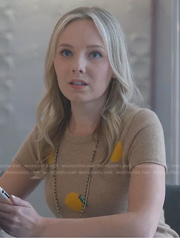 (played by ) on Good Trouble on Freeform was spotted wearing this beige fruit print sweater on Good Trouble on episode 'Opening Statements' (3x16) in Aug 2021. 's Sweater is the Short Sleeve Cashmere Tee in Oranges by J. Crew.