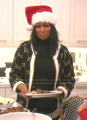 Garcelle Beauvais on The Real Housewives of Beverly Hills on Bravo was spotted wearing this black and gold GG print cardigan on The Real Housewives of Beverly Hills on episode 'Season’s Grillings' (11x13) in Aug 2021. Garcelle's Sweater is the GG Metallic Jacquard Wool Blend Cardigan by Gucci.