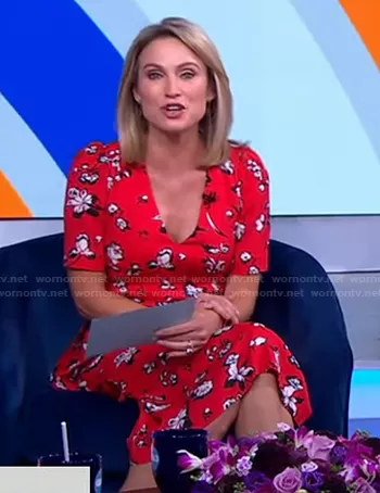 Amy Robach on Good Morning America on ABC was spotted wearing this red floral print v-neck dress on Good Morning America on Aug 19 2021's episode. Amy's Dress is the Joia Dress by Veronica Beard.