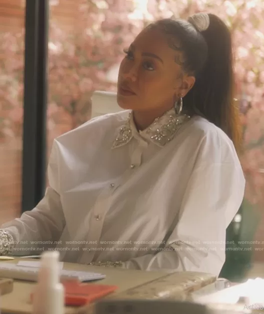 (played by ) on Grown-ish on Freeform was spotted wearing this Esme Sharps white embellished blouse on Grown-ish on episode 'A Peace of Light' (4x07) in Aug 2021. 's Top is the Reagan crystal-embellished shirt by Retrofete.