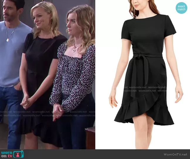 Belle Brady (played by Martha Madison) on Days of our Lives on Peacock was spotted wearing this black belted ruffle hem dress on Days of our Lives on Aug 21 2021's episode. Belle's Dress is the Ruffle Hem Belted Dress by Calvin Klein.