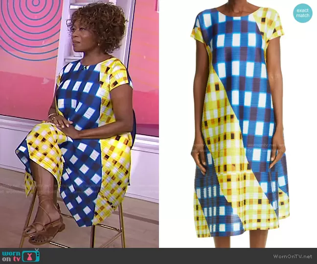 on Today on NBC was spotted wearing this mixed check print dress on Today on Aug 23 2021's episode. 's Dress is the Trek Check Plissé Midi Dress by Pleats Please Issey Miyake.