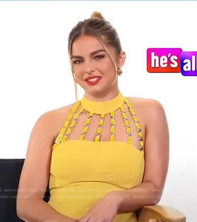 on E! News on E! was spotted wearing this yellow studded strappy dress on E! News Daily Pop on Aug 23 2021's episode. 's Dress is the Short Dress by Versace.