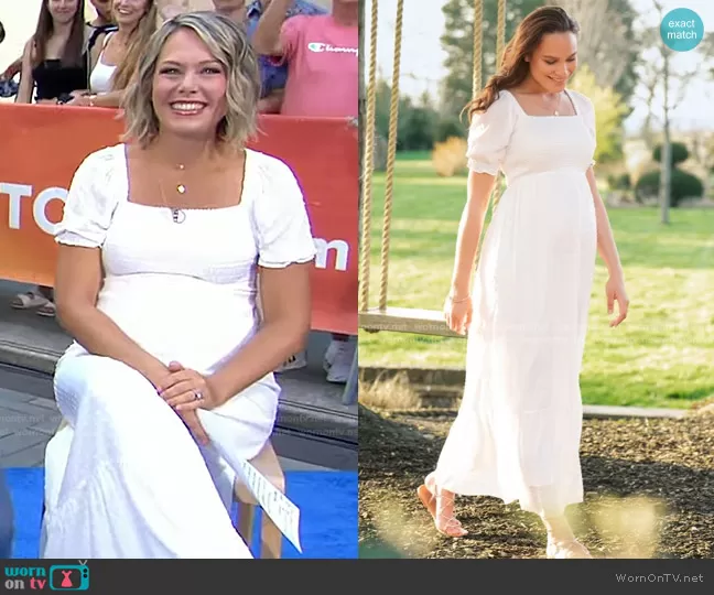 Dylan Dreyer on Today on NBC was spotted wearing this white smocked maternity dress on Today on Aug 24 2021's episode. Dylan's Dress is the Shirred Maternity Maxi Dress by Seraphine.