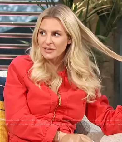 Morgan Stewart on E! News on E! was spotted wearing this red denim romper on E! News Daily Pop on Aug 24 2021's episode. Morgan's Romper is the The Gatherer Zip-Front Romper by Mother.