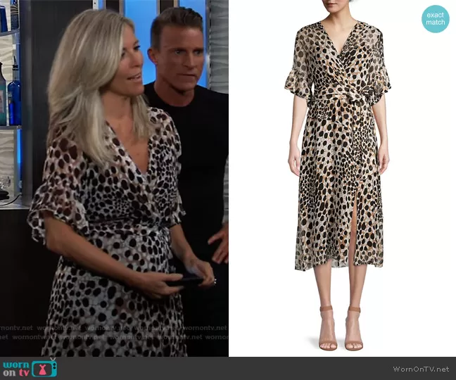 Carly Spencer (played by Laura Wright) on General Hospital on ABC was spotted wearing this printed wrap dress on General Hospital on Aug 26 2021's episode. Carly's Dress is the Ava Cheetah-Print Silk Dress by Elie Tahari.