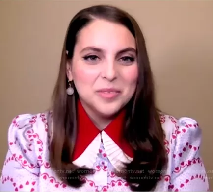 on Good Morning America on ABC was spotted wearing this heart print dress on Good Morning America on Aug 25 2021's episode. 's Dress is the Belted Pleated Printed Silk-Twill Midi Dress by Rodarte.