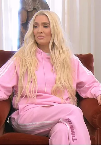 Erika Jayne on The Real Housewives of Beverly Hills on Bravo was spotted wearing this pink side striped hoodie and jogger pants on The Real Housewives of Beverly Hills on episode 'Lips Unsealed' (11x14) in Aug 2021. Erika's Sweater is the Ninja Hoodie by Adidas . Erika's Pants is the Ninja Pants by Adidas.