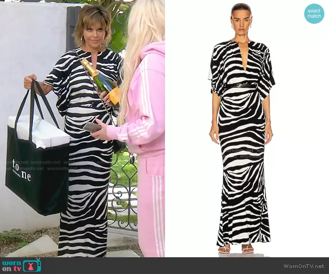 Lisa Rinna on The Real Housewives of Beverly Hills on Bravo was spotted wearing this zebra print maxi dress on The Real Housewives of Beverly Hills on episode 'Lips Unsealed' (11x14) in Aug 2021. Lisa's Dress is the Obie Gown by Norma Kamali.