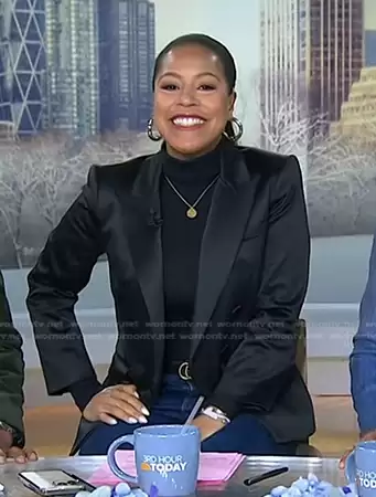 Sheinelle Jones on Today on NBC was spotted wearing this black double breasted blazer on Today on Jan 17 2024's episode. Sheinelle's Jacket is the Dickey Double Breasted Blazer by Veronica Beard . Sheinelle's Belt is the Reversible Logo-Plaque Belt by Gucci.