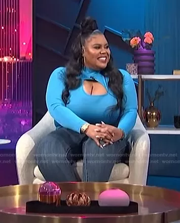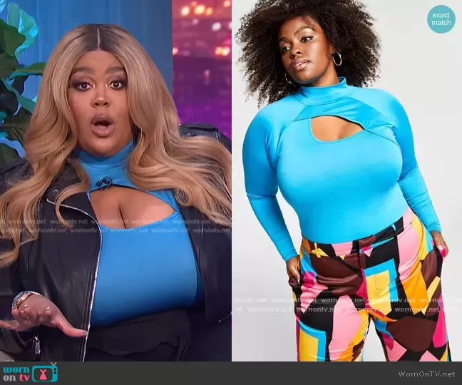 Nina Parker on E! News on E! was spotted wearing this blue cutout bodysuit on E! News Nightly Pop on May 12 2022's episode. Nina's Bodysuit is the Trendy Plus Size Cutout Bodysuit by Nina Parker.