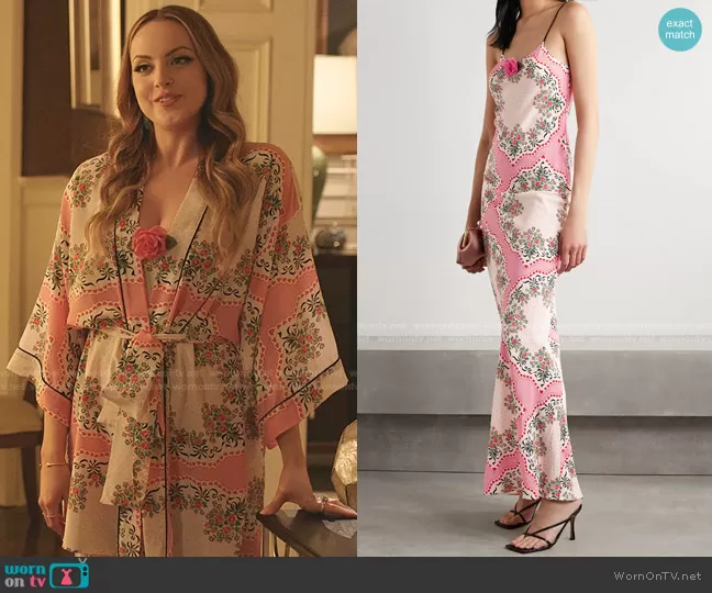 Fallon Carrington (played by Elizabeth Gillies) on Dynasty on The CW was spotted wearing this pink and white floral robe on Dynasty on episode 'The British Are Coming' (4x16) in Aug 2021. Fallon's Dress is the Embellished Printed Silk crepe de chine Maxi Dress by Rodarte . Fallon's Robe is the Belted Printed Silk crepe de chine Robe by Rodarte.