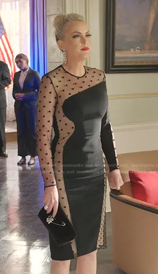 Alexis Carrington (played by Elaine Hendrix) on Dynasty on The CW was spotted wearing this black polka dot mesh panel dress on Dynasty on episode 'The British Are Coming' (4x16) in Aug 2021. Alexis's Dress is the Arielle Polka Dot Illusion Cady Cocktail Dress by Stella McCartney . Alexis's Bag is the Safety Pin-Embellished Velvet Clutch by Burberry.