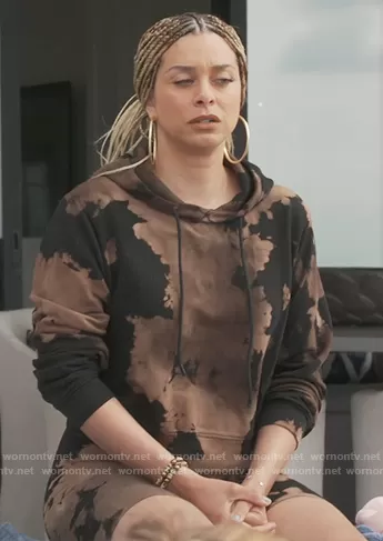 Robyn Dixon on The Real Housewives of Potomac on Bravo was spotted wearing this brown tie dye sweatshirt and shorts on The Real Housewives of Potomac on episode 'Talk to the Braids' (6x08) in Aug 2021. Robyn's Sweater is the Milan Hoodie by Cotton Citizen . Robyn's Shorts is the Milan Biker Short by Cotton Citizen.
