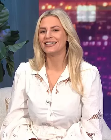 Morgan Stewart on E! News on E! was spotted wearing this white lace inset shirtdress on E! News Daily Pop on Aug 30 2021's episode. Morgan's Dress is the Rebello Cotton Lace Inset Shirt Dress by Maje.