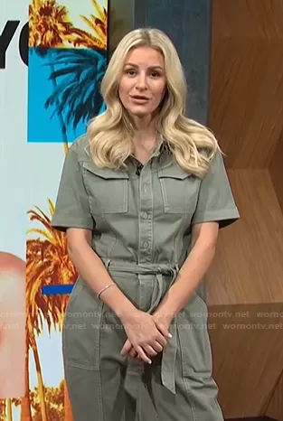 Morgan Stewart on E! News on E! was spotted wearing this green tie waist jumpsuit on E! News Daily Pop on Aug 31 2021's episode. Morgan's Jumpsuit is the Marissa Jumpsuit by Jonathan Simkhai.