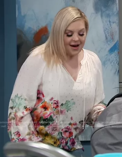 Maxie Jones (played by Kirsten Storms) on General Hospital on ABC was spotted wearing this white floral metallic blouse on General Hospital on Jul 29 2022's episode. Maxie's Top is the Helena Floral Puff-Sleeve Blouse by Kobi Halperin.