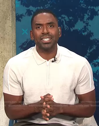 Justin Sylvester on E! News on E! was spotted wearing this light grey zip polo shirt on E! News Daily Pop on Sep 01 2021's episode. Justin's Shirt is the Gammo Short Sleeve Polo by Reiss.