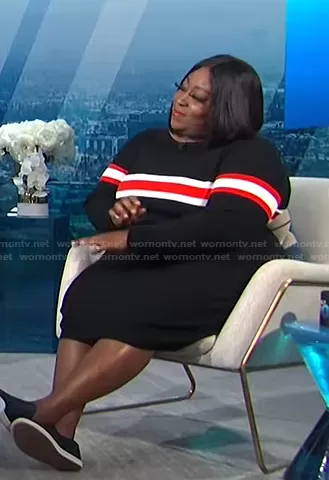 Loni Love on E! News on E! was spotted wearing this black striped ribbed dress on E! News Daily Pop on Sep 01 2021's episode. Loni's Dress is the Thick Stripe Sweater Dress by Ashley Stewart.