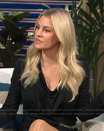 Morgan Stewart on E! News on E! was spotted wearing this black chain-detail wrap dress on E! News Daily Pop on Sep 02 2021's episode. Morgan's Dress is the Chain-Detail Midi Dress by Bottega Veneta.