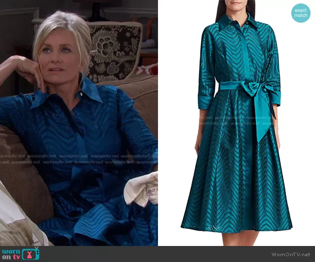 Kayla Brady (played by Mary Beth Evans) on Days of our Lives on Peacock was spotted wearing this teal eyelet shirtdress on Days of our Lives on Sep 04 2021's episode. Kayla's Dress is the Taffeta Jacquard Lace Eyelet A-Line Belted Shirtdress by Teri Jon.