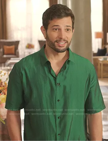 Sam Flores (played by Rafael de la Fuente) on Dynasty on The CW was spotted wearing this green short sleeve shirt on Dynasty on episode 'Stars Make You Smile' (4x17) in Sep 2021. Sam's Shirt is the Iridescent Silk Shirt by Saint Laurent.