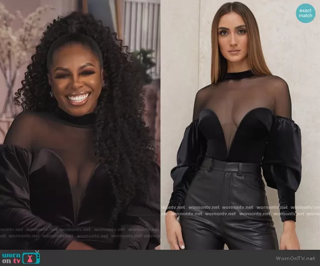 Candiace Dillard Bassett on The Real Housewives of Potomac on Bravo was spotted wearing this black mesh velvet top on The Real Housewives of Potomac on episode 'High Infidelity' (6x09) in Sep 2021. Candiace's Bodysuit is the Monique Black Velvet and Tulle Bodysuit by House of CB.