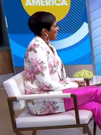 on Good Morning America on ABC was spotted wearing this white floral blazer on Good Morning America on Sep 06 2021's episode. 's Jacket is the Flora Print Blazer by Paco Rabanne.