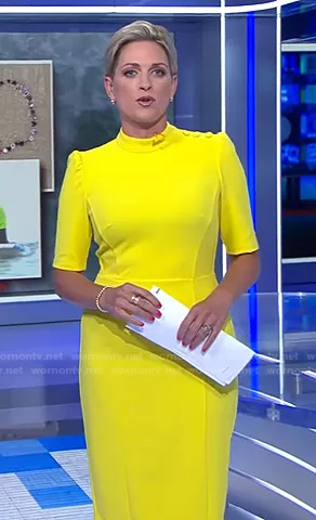on CBS Evening News on CBS was spotted wearing this yellow button detail dress on CBS Evening News on Sep 06 2021's episode. 's Dress is the Stretch Crepe Mock Neck Button Dress by Donna Morgan.