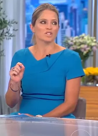 Sara Haines on The View on ABC was spotted wearing this blue ruffle neck jumpsuit on The View on Sep 08 2021's episode. Sara's Jumpsuit is the Pensthorpe Crepe Jumpsuit by Roland Mouret.