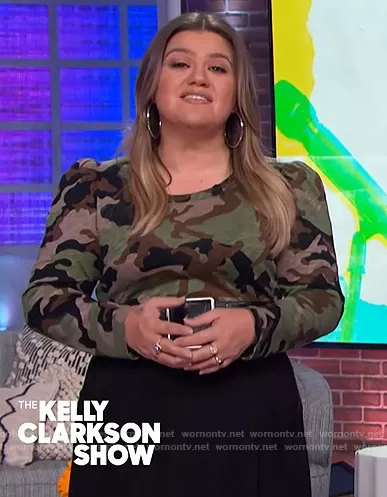 Kelly Clarkson on The Kelly Clarkson Show on NBC was spotted wearing this long sleeve camo tee on The Kelly Clarkson Show on Sep 08 2021's episode. Kelly's Top is the Porter Camo Baseball Tee by Veronica Beard Jeans.