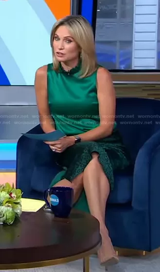 Amy Robach on Good Morning America on ABC was spotted wearing this green ruffle neck top and leopard print skirt on Good Morning America on Sep 08 2021's episode. Amy's Top is the Henrietta Sleveless Blouse by Alice + Olivia . Amy's Skirt is the The Jessica Emerald Silk Bias Midi Skirt by Cami NYC . Amy's Earrings is the Emerald CZ Hoops by Accessory Concierge.