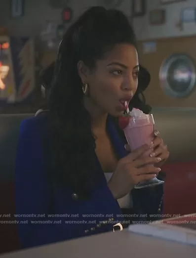 (played by ) on Riverdale on The CW was spotted wearing this blue double breasted blazer on Riverdale on episode 'The Return of the Pussycats' (5x15) in Sep 2021. 's Blazer is the Double Breasted Wool Blazer by Balmain.