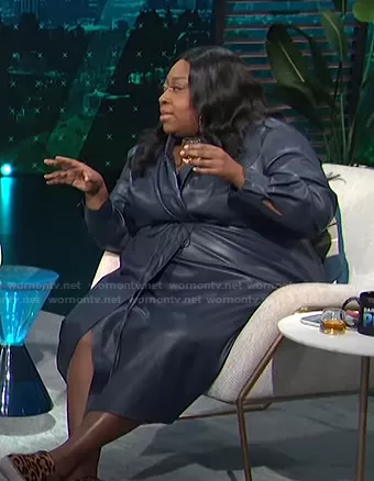 Loni Love on E! News on E! was spotted wearing this dark blue leather wrap dress on E! News Daily Pop on Sep 09 2021's episode. Loni's Dress is the Shawl Collar Vegan Leather Dress by Eloquii.