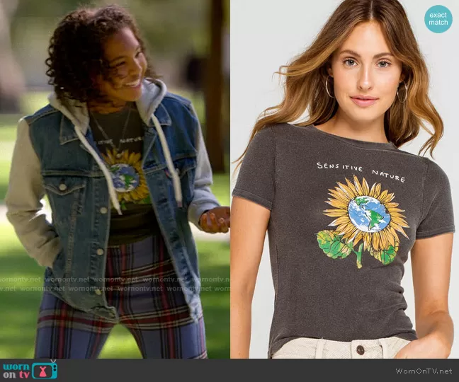 Angelica Porter-Kennard (played by ) on The L Word Generation Q on Showtime was spotted wearing this sunflower t-shirt and hooded denim jacket on The L Word Generation Q on episode 'Lake House' (2x04) in Aug 2021. Angie's Top is the Sensitive Nature Womens Tee by BDG at Urban Outfitters . Angie's Jacket is the Hybrid Original Trucker Jacket by Levis.