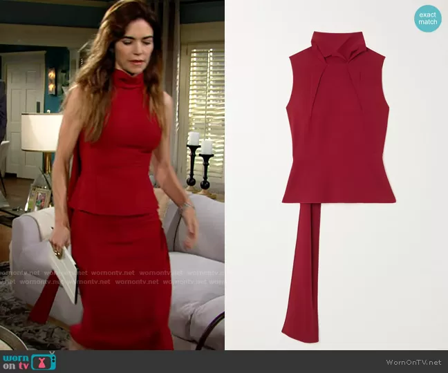 Victoria Newman (played by Amelia Heinle) on The Young and the Restless on CBS was spotted wearing this red peplum top with draped back on The Young and the Restless on Sep 10 2021's episode. Victoria's Top is the Birkhall Top in Crimson by Roland Mouret . Victoria's Skirt is the Arreton Skirt in Crimson by Roland Mouret.
