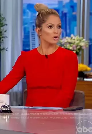 Sara Haines on The View on ABC was spotted wearing this red gathered waist dress on The View on Sep 10 2021's episode. Sara's Dress is the Gathered silk-cady midi dress by Dolce and Gabbana.