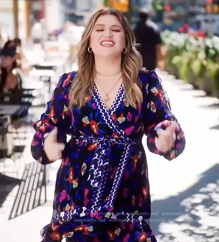 Kelly Clarkson on The Kelly Clarkson Show on NBC was spotted wearing this floral print mini wrap dress on The Kelly Clarkson Show on Sep 13 2021's episode. Kelly's Dress is the Dvf Sol Dress by Diane von Furstenberg.