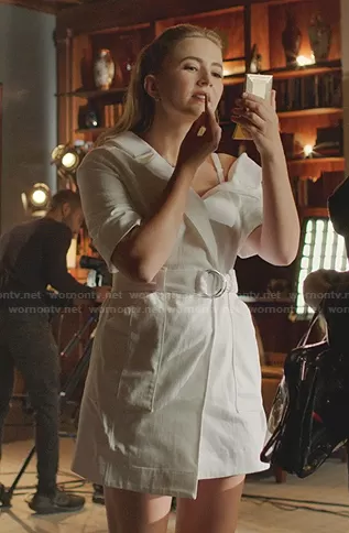 Amanda Carrington (played by Eliza Bennett) on Dynasty on The CW was spotted wearing this white asymmetric belted mini dress on Dynasty on episode 'A Good Marriage in Every Sense' (4x18) in Sep 2021. Amanda's Dress is the Milly Dress by Cinq a Sept.