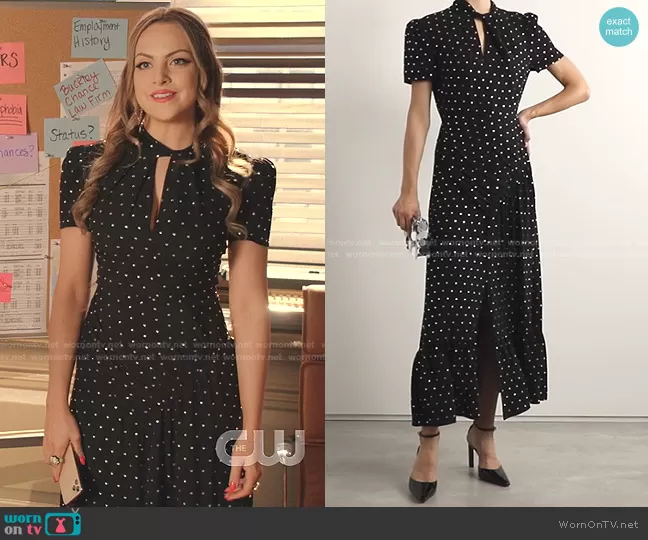Fallon Carrington (played by Elizabeth Gillies) on Dynasty on The CW was spotted wearing this black embellished keyhole dress on Dynasty on episode 'A Good Marriage in Every Sense' (4x18) in Sep 2021. Fallon's Dress is the Gathered Crystal-Embellished Crepe Midi Dress by Self Portrait . Fallon's Earrings is the Proxima Earrings by Lulu Frost .
