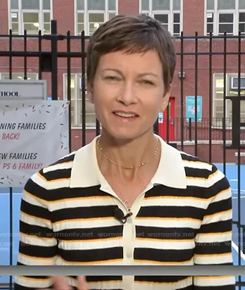 Stephanie Gosk on Today on NBC was spotted wearing this black, white and yellow striped cardigan on Today on Sep 13 2021's episode. Stephanie's Sweater is the Hudson Stripe Cardigan by Theory.