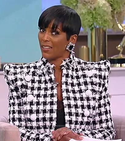 Tamron Hall on Tamron Hall Show on ABC was spotted wearing this tweed check blazer on Tamron Hall Show on Sep 13 2021's episode. Tamron's Blazer is the Button-detailed gingham cotton-blend tweed blazer by Balmain.
